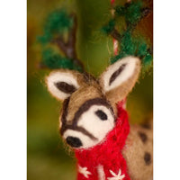This cute felt reindeer wears a red scarf. It has green antlers and a spotted coat and is fitted with a red and white hanging thread. Part of a funky new range of sustainable eco decoration ideas designed in-house at Namaste.